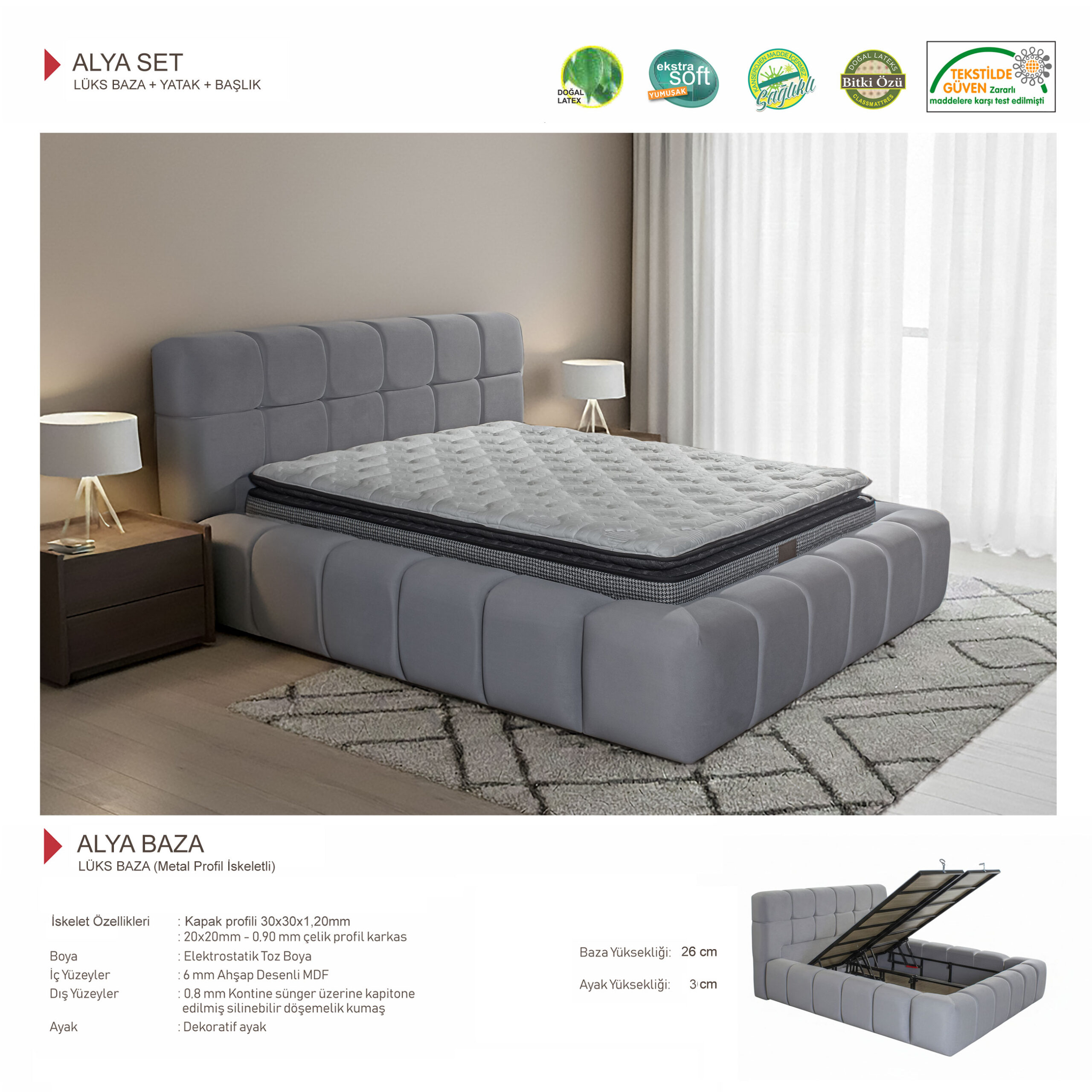 Alya Baza, sağlam metal profil iskeleti ile uzun ömürlü kullanım sunarken, elektrostatik toz boya kaplaması ile dayanıklılığını artırır. İç yüzeylerde kullanılan MDF yapı ve dış yüzeydeki kapitone detaylı, silinebilir kumaş hem estetik hem de pratik kullanım avantajı sağlar.