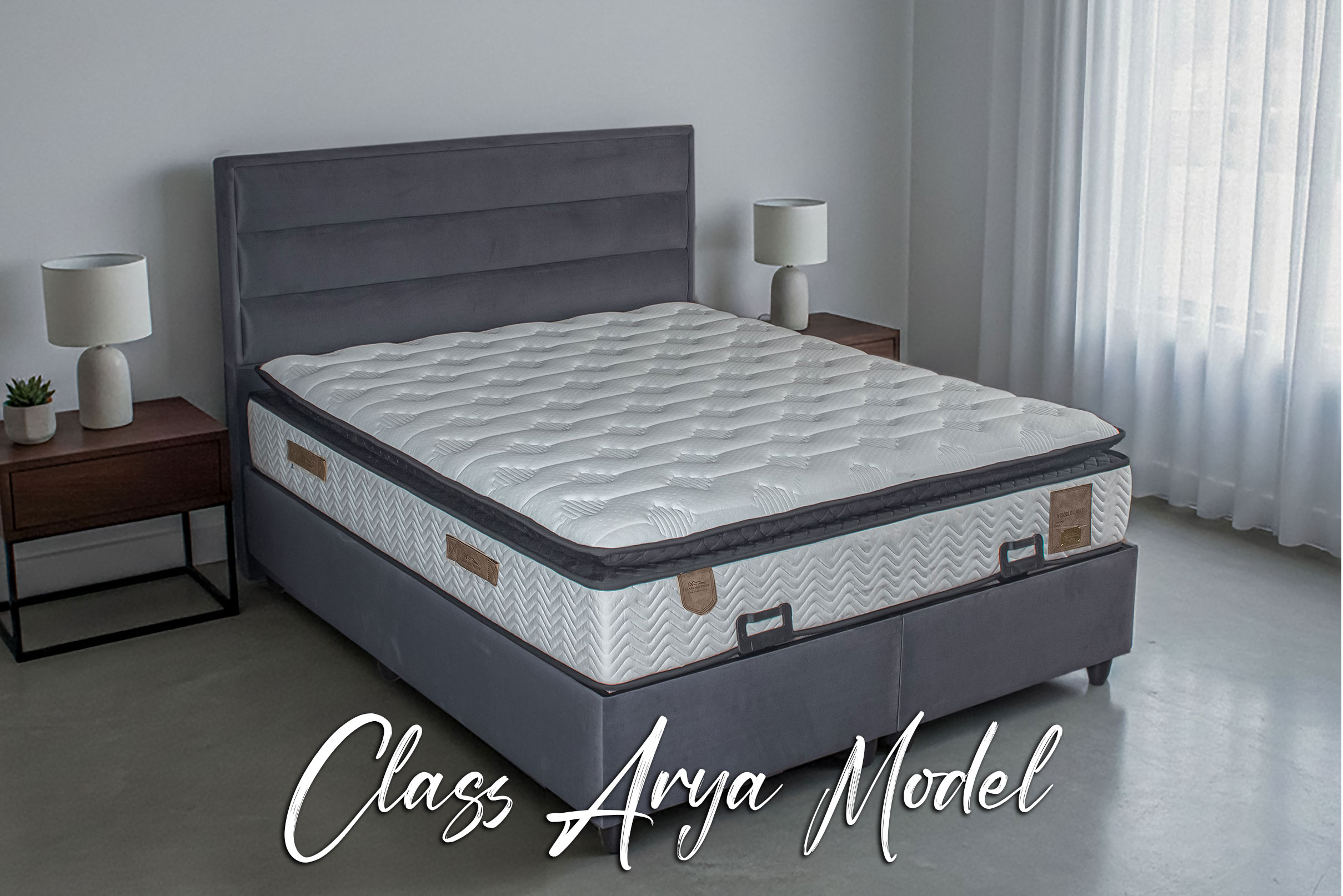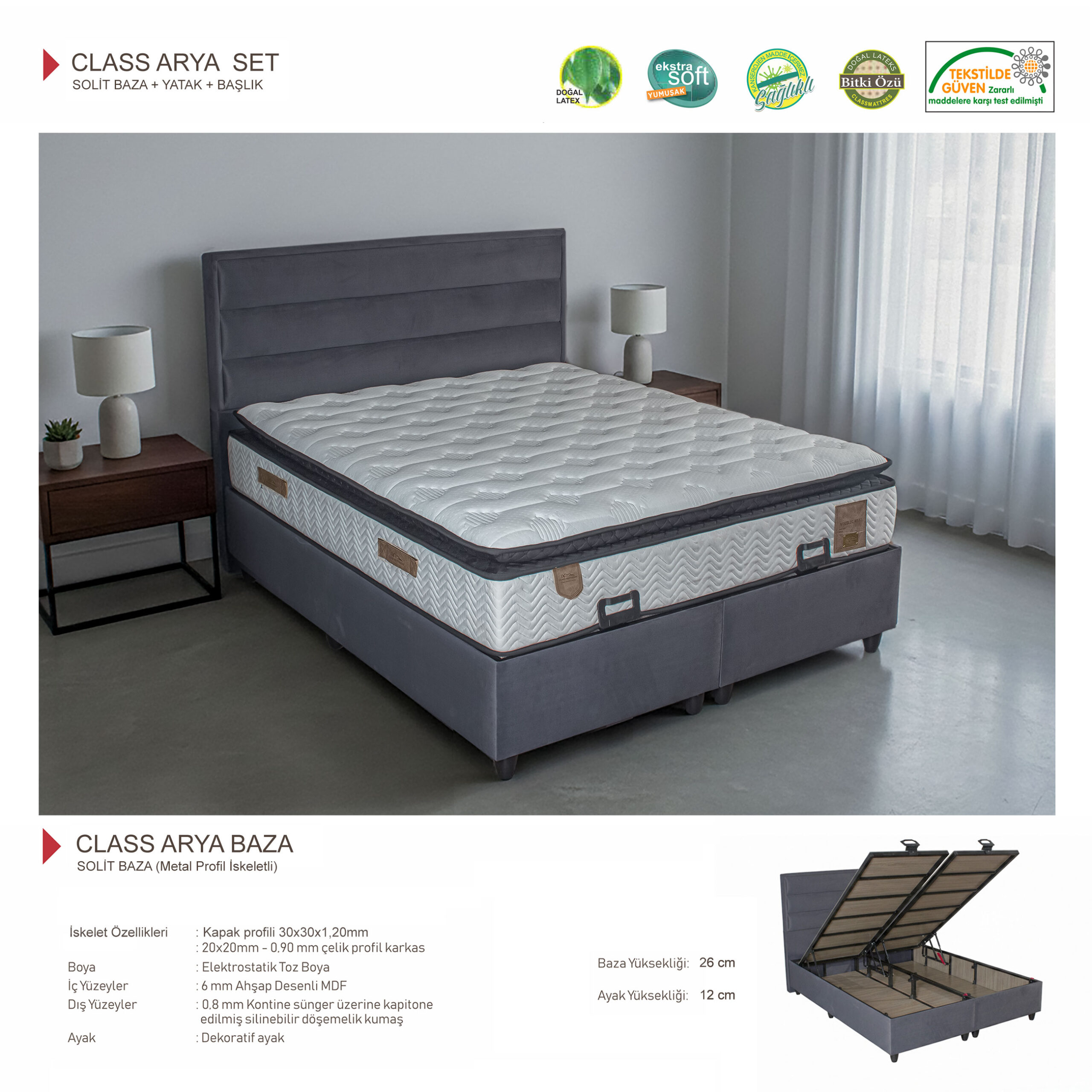 Class Arya Baza, sağlam metal profil iskeleti ile uzun ömürlü kullanım sunar. Elektrostatik toz boya kaplaması sayesinde dayanıklılığı artırılmıştır. İç yüzeylerde kullanılan MDF yapı ve dış yüzeydeki kapitone detaylı, silinebilir kumaş hem estetik görünüm hem de pratik kullanım avantajı sağlar.