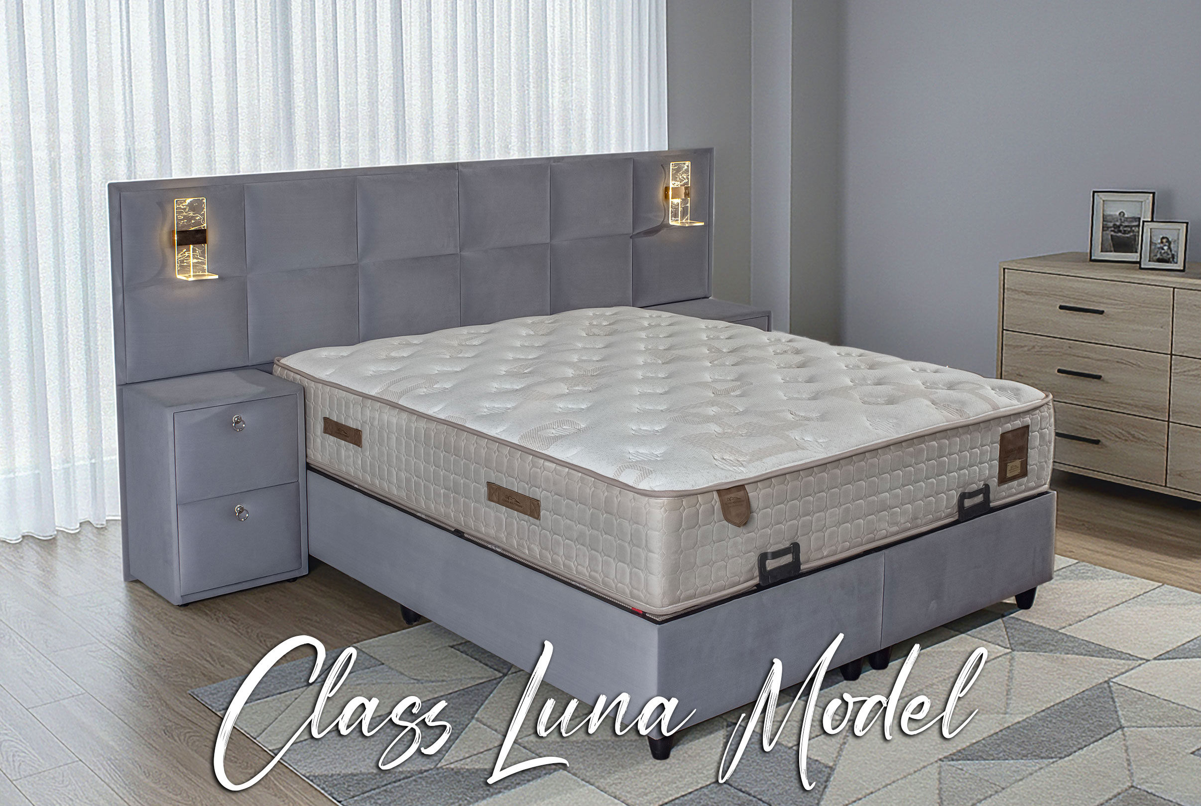 Class Luna’nın en dikkat çekici özelliği, başlık üzerinde yer alan entegre aydınlatma detayları ve fonksiyonel komodin tasarımıdır. Bu sayede hem estetik bir görünüm hem de pratik kullanım avantajı sağlar.