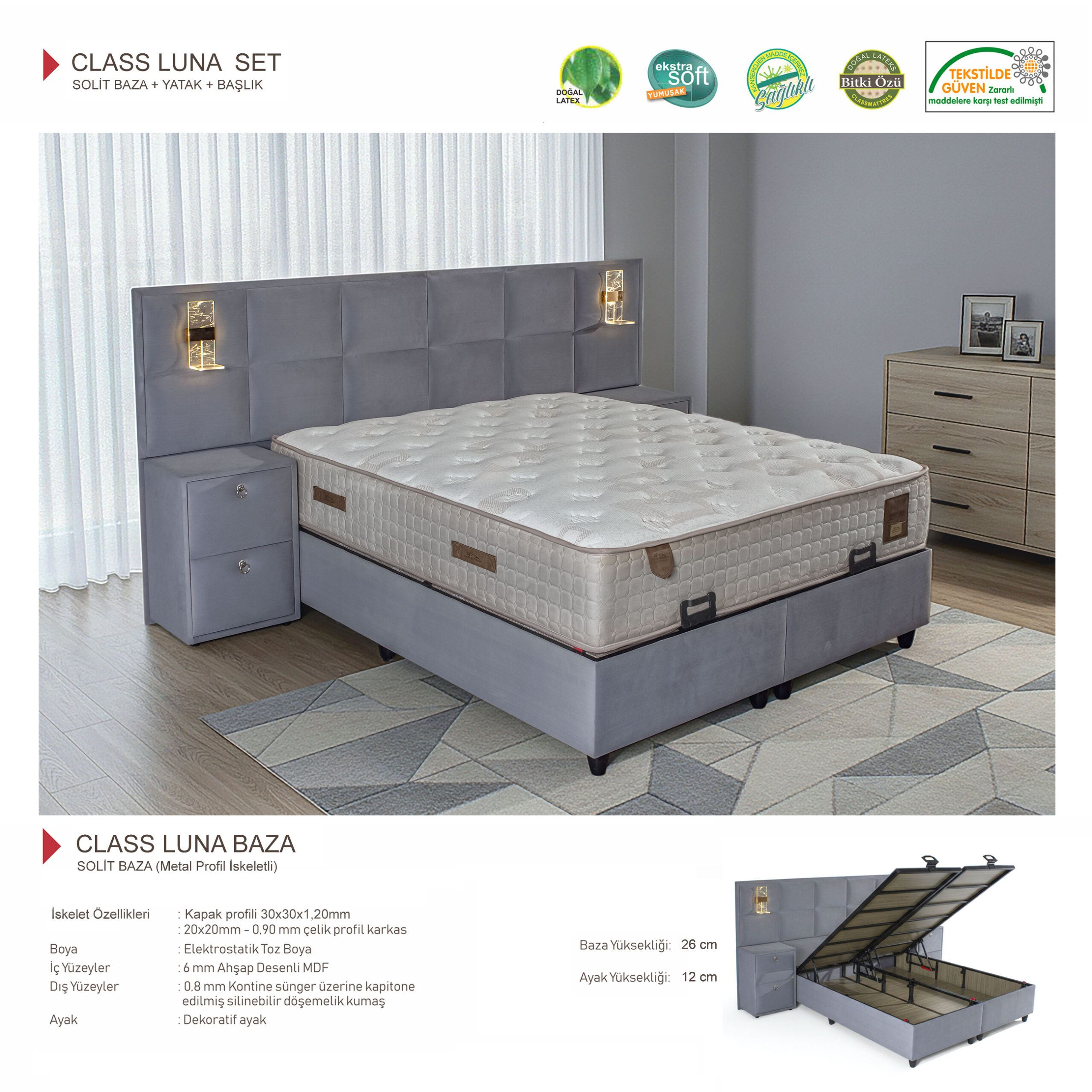 Class Luna Baza, sağlam metal profil iskeleti ile uzun ömürlü kullanım sunar. Elektrostatik toz boya kaplaması sayesinde dayanıklılığı artırılmıştır. İç yüzeylerde kullanılan MDF yapı ve dış yüzeydeki kapitone detaylı, silinebilir kumaş hem estetik hem de kullanım kolaylığı sağlar.