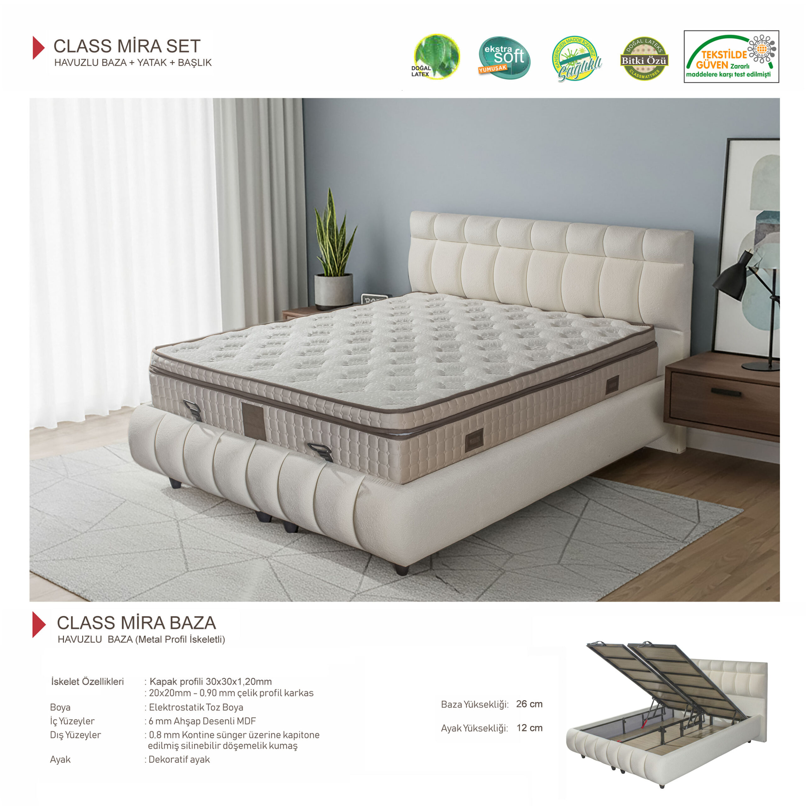 Class Mira Baza, sağlam metal profil iskeleti ile uzun ömürlü kullanım sunar. Elektrostatik toz boya kaplaması ile dış etkenlere karşı dayanıklılığı artırılmıştır. İç yüzeylerde kullanılan MDF yapı ve dış yüzeydeki kapitone detaylı, silinebilir kumaş hem estetik hem de pratik kullanım avantajı sağlar. Havuzlu tasarımı sayesinde yatağı sabitleyerek daha düzenli ve şık bir görünüm sunar.