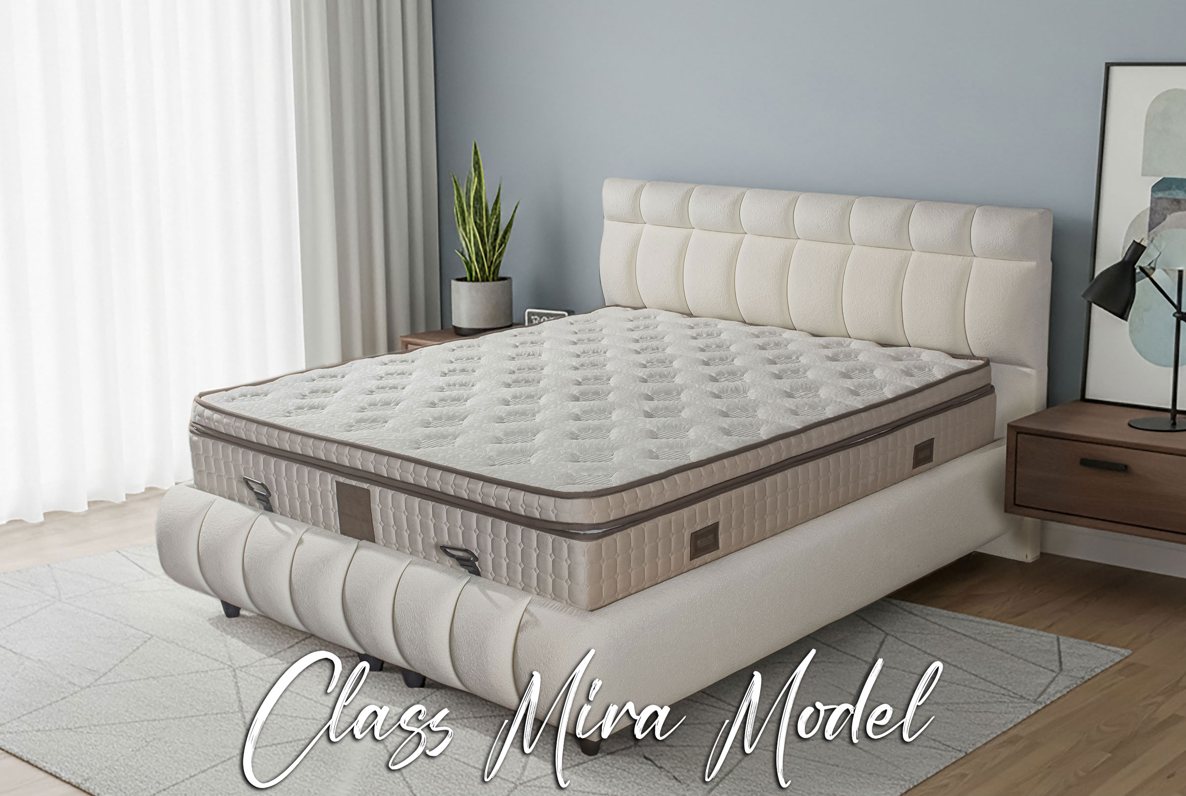 Türkmenbaşı Yatak’ın estetik tasarım anlayışıyla geliştirdiği Class Mira Set, modern çizgileri ve yumuşak detaylarıyla yatak odalarına şıklık katıyor. Havuzlu baza, ergonomik yatak ve zarif başlık tasarımıyla hem görsel hem de fonksiyonel açıdan üst düzey bir deneyim sunar.
